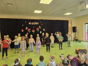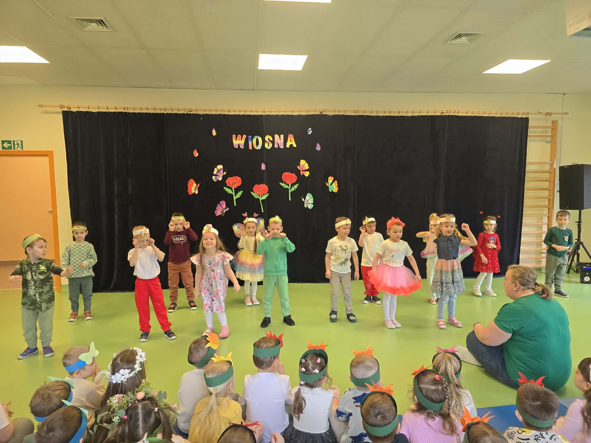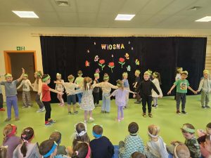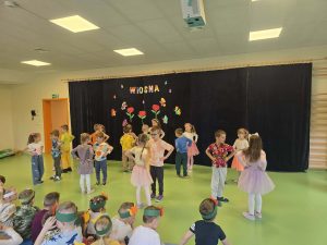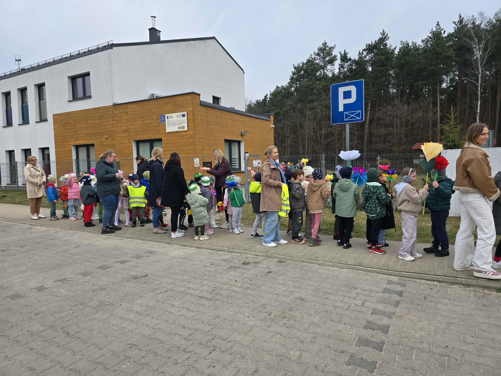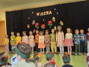 Dnia 20.03.2026 w naszym przedszkolu odbyło się radosne powitanie wiosny. Uroczystość rozpoczęła się występem dzieci na sali gimnastycznej, podczas którego przedszkolaki zaprezentowały piosenki oraz krótkie układy taneczne związane z tematyką wiosenną. Następnie wszyscy uczestnicy wydarzenia wzięli udział we wspólnym pochodzie. Dzieci, trzymając w rękach kolorowe kwiatki oraz grając na instrumentach, wyruszyły na spacer, aby symbolicznie pożegnać zimę i przywitać nadchodzącą wiosnę. Wydarzenie przebiegło w radosnej atmosferze i dostarczyło dzieciom wielu pozytywnych emocji.
