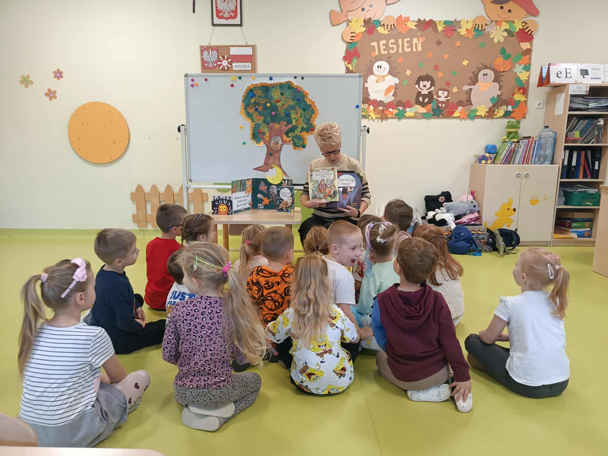 W dniach 23.10. i 24.10.2025r. do naszego przedszkola zawitała Pani Sylwia z Biblioteki Miejskiej w Chocianowie – Filii dla dzieci. Pani bibliotekarka zapoznała dzieci z ciekawą literaturą tj.: „Dzień i noc”, Młodzi Przyrodnicy; „Nocne życie sów”, Pascala Vedere d’ Auria oraz Pierre Couroune; ”Pani Detektyw Sowa”, Adama Święckiego. Jednak najbardziej porywającą okazała się „Nie bój się mnie”, Raahata Kaduji - o nietoperzu, który pragnie mieć przyjaciół, ale wszyscy się go boją… Podczas zajęć dzieci dopasowały cień zwierząt do ich sylwety oraz przyporządkowały poszczególne zwierzęta do aktywności w dzień lub w nocy. Dzięki zajęciom dzieci utrwaliły nazwy zwierząt mieszkających w lesie, nauczyły się rozróżniać zwierzęta aktywne w dzień lub w nocy. Na koniec zajęć dzieci nauczyły się samodzielnie rysować sowę. Bardzo dziękujemy za ciekawie przeprowadzone zajęcia oraz zachęcamy wszystkich rodziców wraz z dziećmi do odwiedzenia Biblioteki. Pamiętajmy, że czytając dziecku książki kształtujemy nim dobre nawyki i motywujemy, aby samodzielnie sięgało po literaturę.