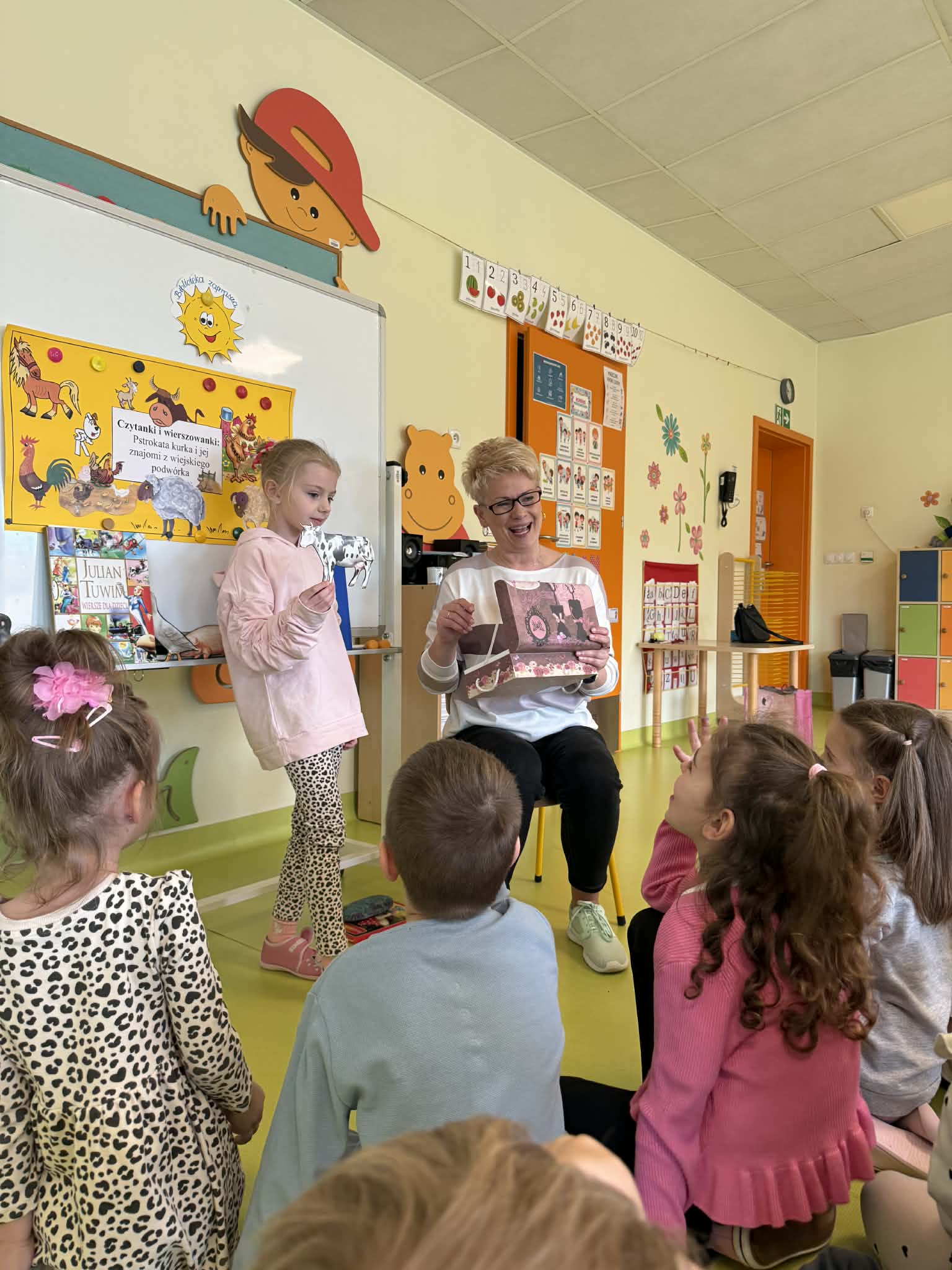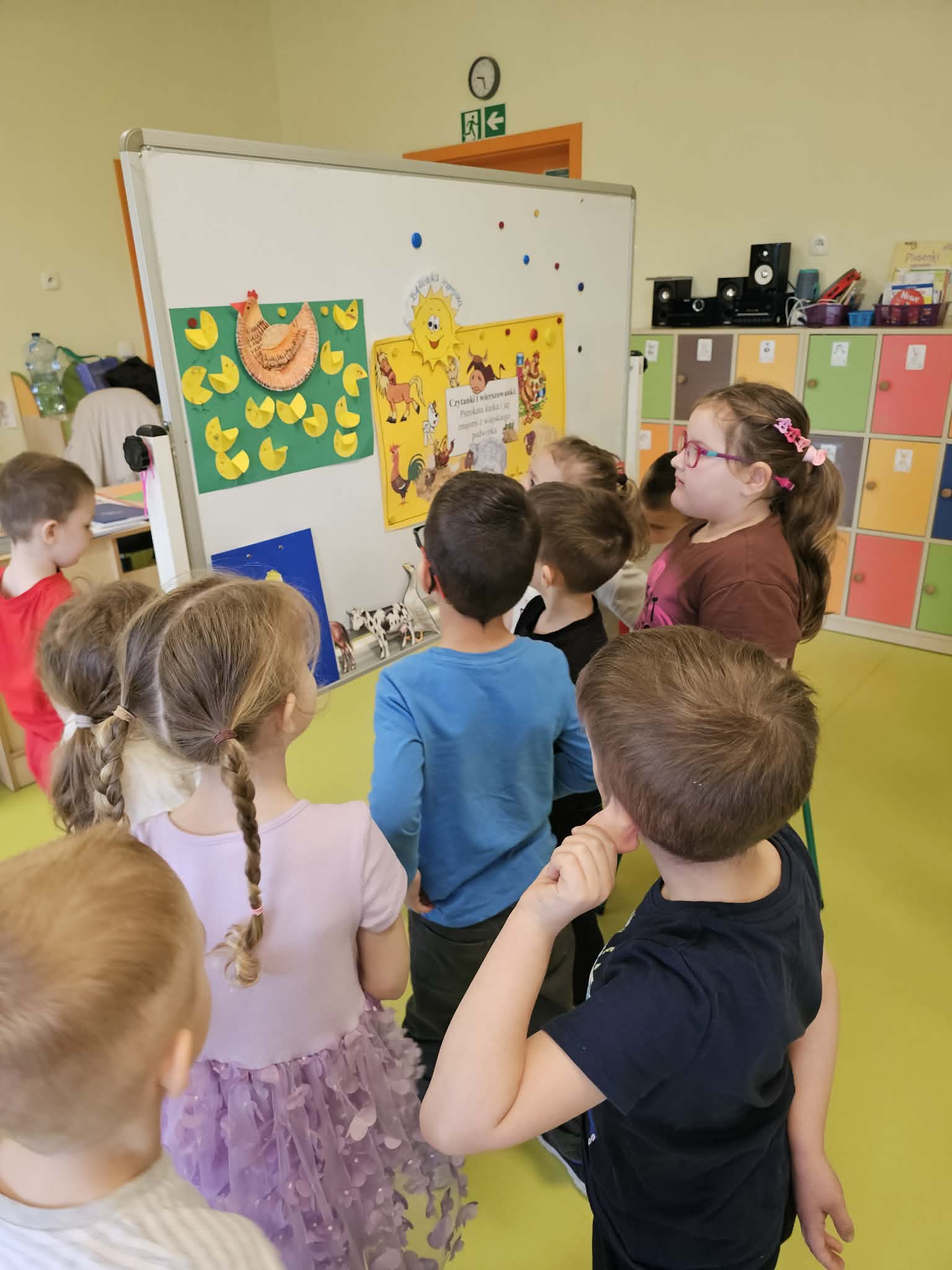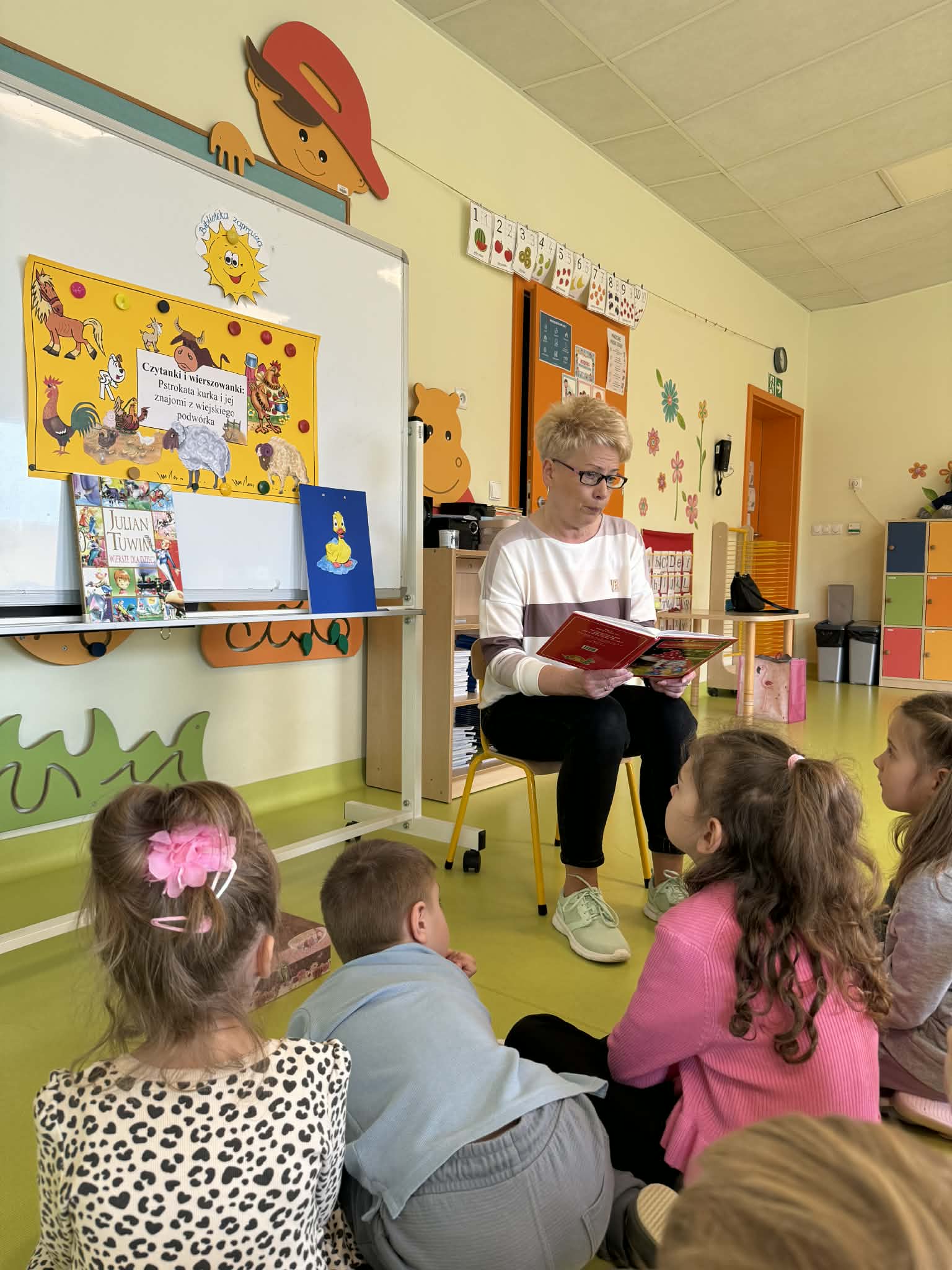 Dnia 13.04.2026 w grupach Wiewiórki, Żabki i Pszczółki odbyły się zajęcia biblioteczne pt. „Pstrokata kurka i jej znajomi z wiejskiego podwórka”. Dzieci miały okazję poznać wiersze o tematyce zwierzęcej, np. „Kwoka” Jana Brzechwy, czy też „W aeroplanie” Juliana Tuwima. Były także ciekawe zabawy ruchowe oraz zwierzęce zagadki. Na zakończenie zajęć dzieci wspólnie stworzyły prace plastyczną przedstawiającą mamę kurkę oraz jej małe pisklątka. Przedszkolaki bawiły się świetnie i bardzo dobrze poradziły sobie ze wszystkimi zadaniami. Czekamy na kolejne spotkanie z Panią bibliotekarką.