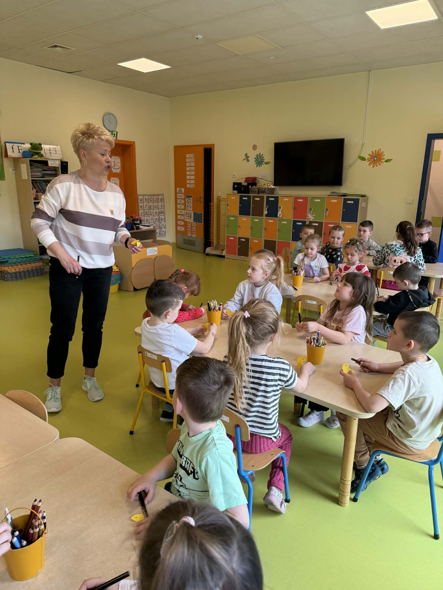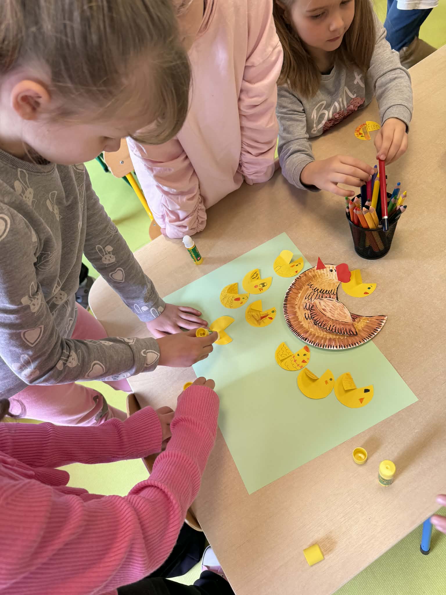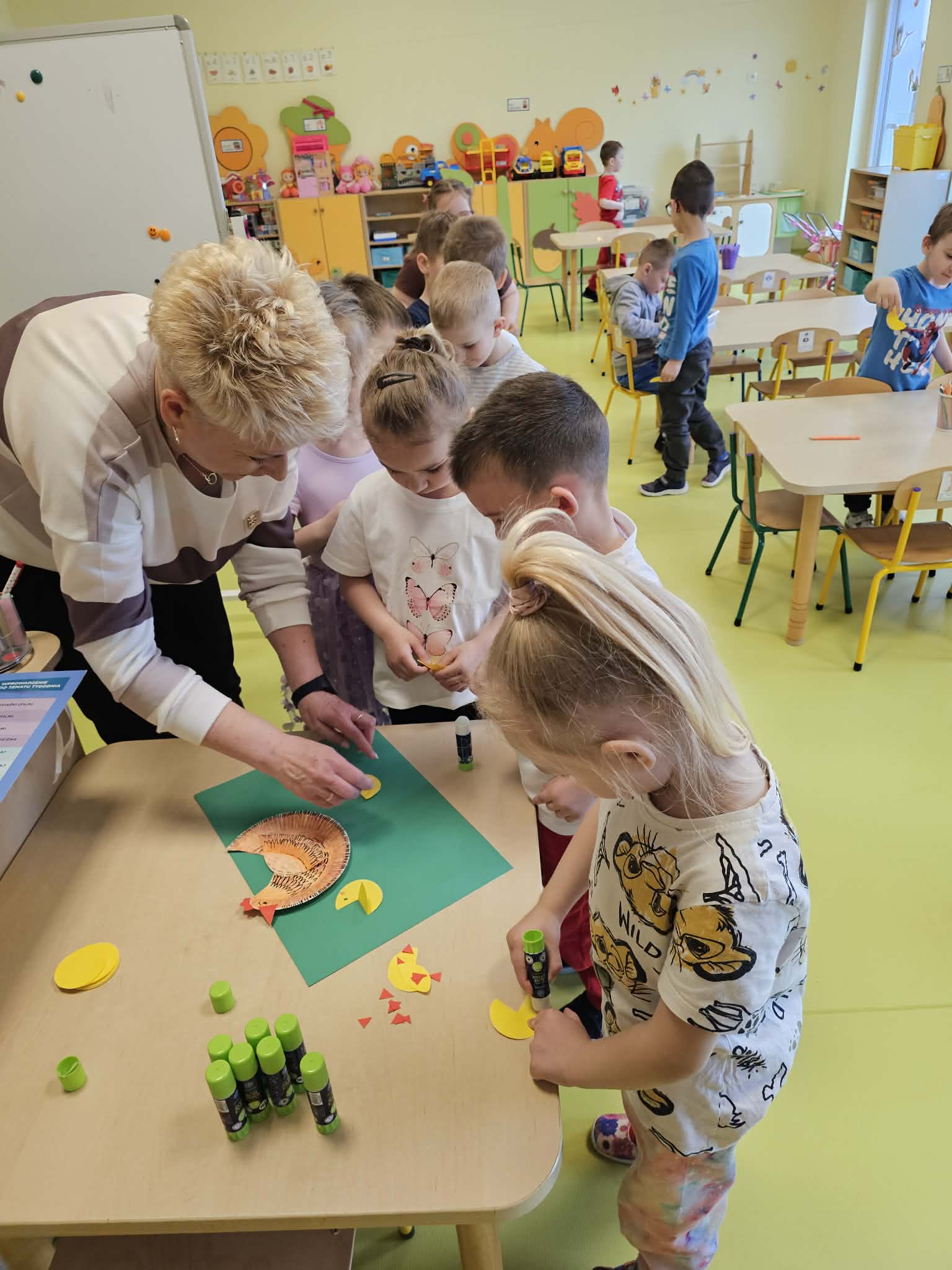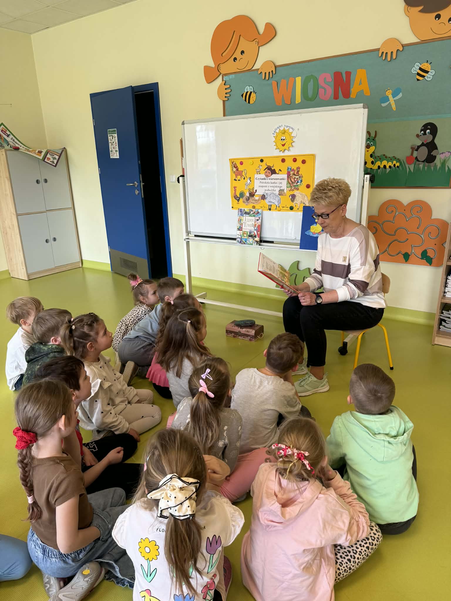 Dnia 13.04.2026 w grupach Wiewiórki, Żabki i Pszczółki odbyły się zajęcia biblioteczne pt. „Pstrokata kurka i jej znajomi z wiejskiego podwórka”. Dzieci miały okazję poznać wiersze o tematyce zwierzęcej, np. „Kwoka” Jana Brzechwy, czy też „W aeroplanie” Juliana Tuwima. Były także ciekawe zabawy ruchowe oraz zwierzęce zagadki. Na zakończenie zajęć dzieci wspólnie stworzyły prace plastyczną przedstawiającą mamę kurkę oraz jej małe pisklątka. Przedszkolaki bawiły się świetnie i bardzo dobrze poradziły sobie ze wszystkimi zadaniami. Czekamy na kolejne spotkanie z Panią bibliotekarką.